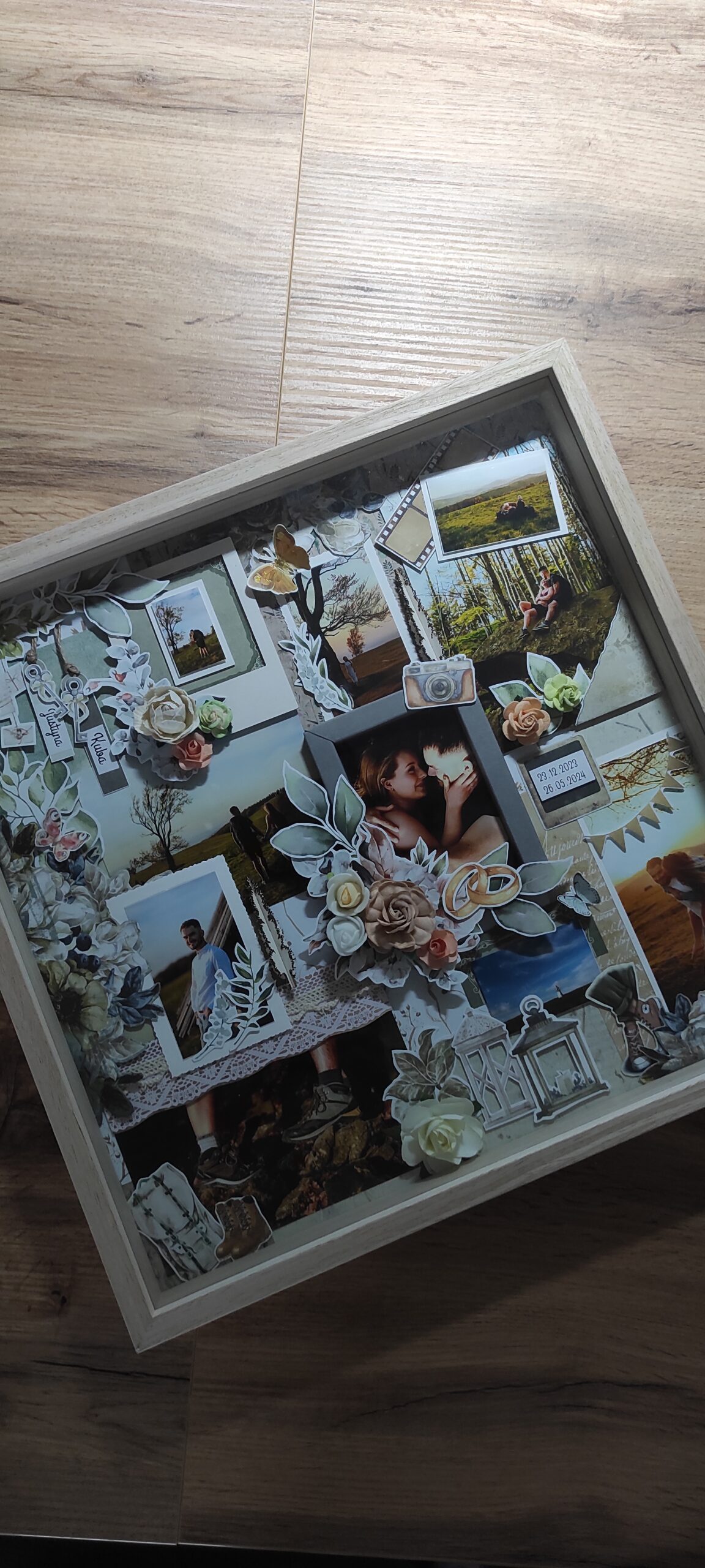 Kolaże, zestawienia, połączenia, kompozycje. Istnieją tysiące aplikacji i programów, które tworzą kolaże ze zdjęć. Coś świetnego!!! Sama uwielbiam łączyć je zgodnie z klimatem, formatem…minimalizować ilość ramek, bo już więcej nie zmieści się na ścianie. Jeśli kolaż, to łączenie różnych technik- od razu pojawiam się ja. Pojawiam się z propozycją stworzenia dla Was kolażu namacalnego. Zawierającego te same zdjęcia, jednak dopieszczone klimatycznymi motywami, czy to pluszowych zabawek obok siostrzyczki, czy kwiatów obok mamy w ogrodzie. Może macie stary, poniszczony album z wywołanymi zdjęciami i chcielibyście go odświeżyć? Czy może, jak moja znajoma, z moją pomocą, stworzycie sentymentalny prezent dla koleżanki na wieczór panieński? Takich pomysłów są miliardy! Z przyjemnością Wam pomogę ![]()